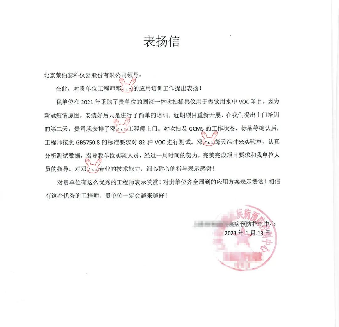 近日,北京萊伯泰科儀器股份有限公司(以下簡(jiǎn)稱“萊伯泰科”)收到了來(lái)自某疾病預(yù)防控制中心的感謝信,這封感謝信表彰了萊伯泰科工程師在飲用水中82種VOCs檢測(cè)項(xiàng)目中給予的大力支持與協(xié)助,對(duì)工程師在應(yīng)用培訓(xùn)工作中表現(xiàn)出的專業(yè)技術(shù)能力和敬業(yè)精神提出了表?yè)P(yáng),并對(duì)萊伯泰科提供的整體解決方案予以高度認(rèn)可。