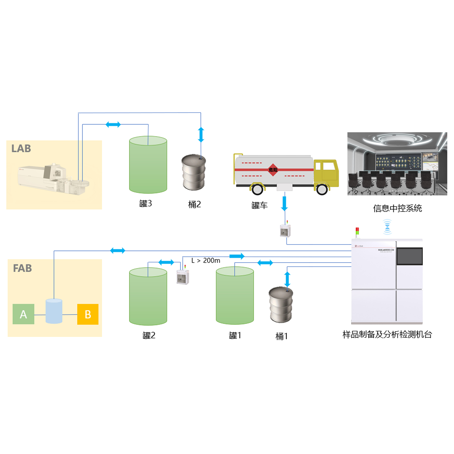 MidiLab9000-CSI 電子級試劑金屬雜質(zhì)含量在線分析系統(tǒng)是一款用于半導(dǎo)體廠務(wù)及FAB產(chǎn)線中電子級濕化學(xué)品金屬雜質(zhì)含量的在線監(jiān)測系統(tǒng),提供電子級濕化學(xué)品“采樣-傳輸-稀釋-標(biāo)曲-內(nèi)標(biāo)-進(jìn)樣-分析-報告”全流程解決方案。