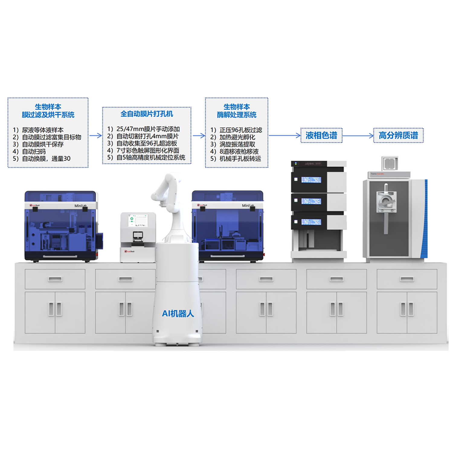 MidiLab9000-Marker組學(xué)樣本制備分析系統(tǒng)采用生物樣本膜過濾烘干系統(tǒng)、全自動膜片打孔、生物樣本酶解處理系統(tǒng),與液相色譜-質(zhì)譜聯(lián)用方法相結(jié)合,實現(xiàn)蛋白提取、制備,并對生物樣本中蛋白進行定性定量分析。