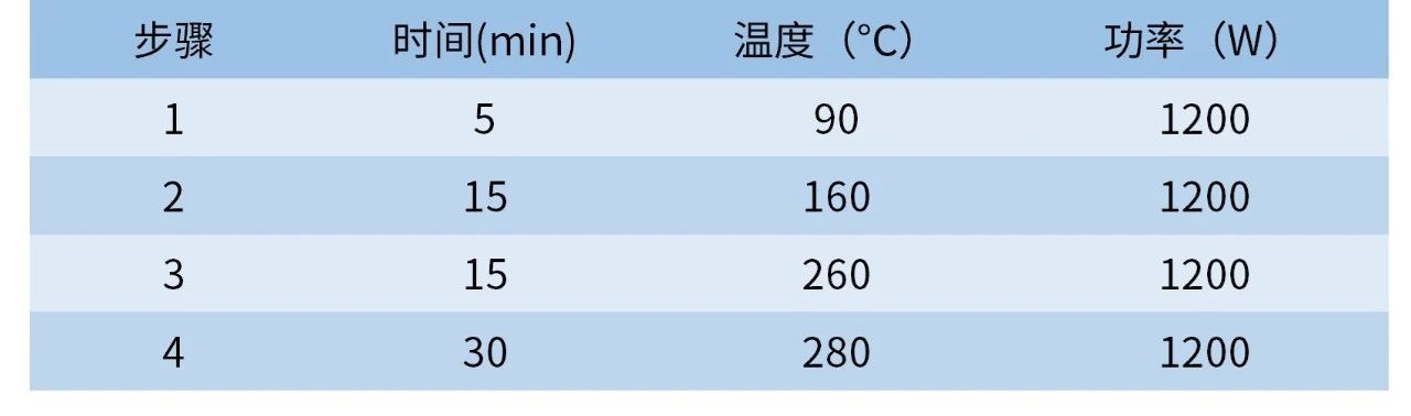 準(zhǔn)確稱(chēng)取0.1g左右樣品(精確至0.0001g)放入干燥潔凈的石英管中,至于支架上;每根管子分別添加4mL硝酸及適量氧化劑;蓋上樣品管蓋后,將支架放入已添加載液(150mL純水,5mL硫酸)的內(nèi)襯筒中,預(yù)加壓;按照表1中升溫程序進(jìn)行消解。程序運(yùn)行完畢后,冷卻取出,打開(kāi)罐蓋,取出樣品,擦干儀器。